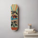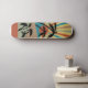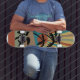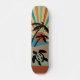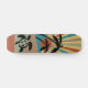 Este monopatín ofrece una puesta del sol abstracta del paisaje marino con palmeras y una tortuga de mar.