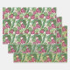 Hojas de monstera tropical rosa y verde y frondas de palmeras sobre fondo blanco, plateado y dorado, te divertirás con estas sábanas de papel envolvente.