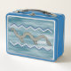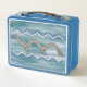 Los diseños de zigzag azules y blancos aparecen encima y debajo de un serpentino monstruo del lago canadiense con cabezas de oveja en esta criptid obra original de Richard H. Fay.