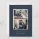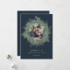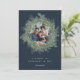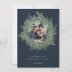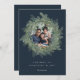 Elegante y subestimado tarjeta de fotos de vacaciones cuenta con un rico fondo azul marino con una exuberante corona botánica de pino follaje alrededor de tu foto favorita. Personaliza con un saludo personalizado y tus nombres debajo (mostrados con "bodas de confort y alegría"). Añade dos fotos adicionales y un mensaje personal personalizado a la parte posterior para completar este encantador diseño de Navidades.