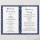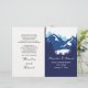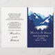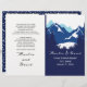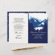 Montañas azules y coníferas plegadas programa de bodas. Un diseño de bodas moderno y elegante que presenta una cordillera a través de coníferas y sus nombres en estilo manuscrito. El interior incluye bordes azules y blancos con puntos de polka y marcos blancos con el texto.