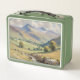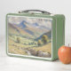 Relájese y disfrute de su almuerzo para llevar como si fuera un picnic en el tranquilo campo. Esta metalizado lonchera cuenta con un ilustracion a ambos lados, de montañas, árboles, un arroyo y nubes blancas, en un estilo acuático. Personaliza con un nombre u otro texto de tu elección, en la parte superior de la foto en la parte delantera de la caja de almuerzo. Un regalo ideal para los amantes de la naturaleza.