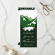 Ceremonia de montañas verdes y árboles de coníferas y programa de boda fiesta. Un elegante diseño de bodas con una cordillera a través de coníferas y nombres escritos a mano. En la parte trasera se encuentran los bordes verde oscuro y blanco, con puntos de polka blanco en la parte superior y en la parte inferior de la tarjeta.