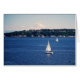 El Monte Rainier es un enorme estratovolcán ubicado a 87 km al sudeste de Seattle, Estados Unidos. Es la montaña más prominente en los Estados Unidos contiguos y el Arco Volcánico de la Cascada, con una elevación de la cumbre de 14.411 pies (4.392 m). ¡Es increíble! En la parte trasera de la tarjeta hay otra vista de los veleros en Puget Sound con el Monte Rainier amenazando en el horizonte.