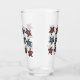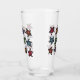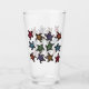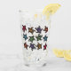 Este vaso de vidrio para bebidas tiene un montón de tortugas negras con marcas abstractas en sus conchas brujas en una multitud de colores brillantes en la parte delantera y trasera.
