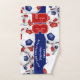 Esta toalla de espíritu de equipo para jugadores de fútbol tiene balones de fútbol de tamaño variado con colores de equipo rojo y azul girados de todas maneras en un fondo blanco y un número prominente de camiseta roja sobre una franja de color azul de longitud completa, sobre la que también se puede personalizar el nombre del atleta, nombre del equipo y nombre de la mascota en blanco - por katz_d_zynes