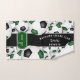 Esta toalla de espíritu de equipo para un jugador de fútbol tiene colores de equipo variados verde y negro bolas de fútbol giradas en todo el camino sobre un fondo blanco - personalizar la toalla de mano y la toalla de baño con un número jersey prominente en verde sobre una franja de color negro de largo, sobre la que también se puede personalizar el nombre del atleta, nombre del equipo y nombre de la mascota en blanco - por katz_d_zynes