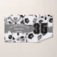 Esta toalla de espíritu de equipo para jugadores de fútbol tiene balones de fútbol de tamaño variado con colores de equipo negro y gris girados de todas maneras en un fondo blanco y un número prominente de camiseta en negro sobre una franja de color gris de longitud completa, sobre la que también se puede personalizar el nombre del atleta, nombre del equipo y nombre de la mascota en blanco - por katz_d_zynes