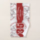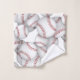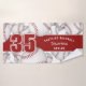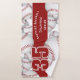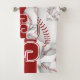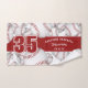 Esta fresca toalla para jugadores de béisbol o de softball tiene unas pelotas blancas de tamaño variado, realistas y limpias, todas giradas en un fondo blanco y un número jersey prominente en rojo, encima de una franja de color rojo negrita y larga, sobre la que también se puede personalizar el nombre del atleta, el nombre del equipo y el nombre de la mascota - por katz_d_zynes