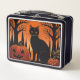Un gatito negro y elegante se sienta bajo una luna llena y brillante, lanzando una silueta enigmática contra el vibrante cielo naranja. Los árboles de silueta y las calabazas esparcidas por debajo le dan un toque de brillo a la escena. ¿Sabían que en el antiguo Egipto, los gatos eran venerados como animales sagrados y a menudo estaban asociados con la diosa Bastet, que representaba protección, placer y buena salud? Esta obra de arte capta la mística de la noche de Halloween y la duradera conexión del felino con lo sobrenatural.