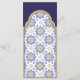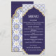 Add timeless elegance and global charm to your wedding tablescape with this Moroccan tile wedding menu card, featuring a rich indigo background and a beautifully illustrated Moorish floral tile arch inspired by arched Moroccan windows. The intricate geometric and floral detailing reflects classic Moroccan and Moorish architecture, creating a design that feels both luxurious and culturally inspired.