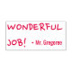 Este divertido diseño de sello de goma incluye el motivador mensaje "¡TRABAJO MARAVILLOSO!" y el nombre personalizado del profesor o educador. Podría ser utilizado por un profesor, educador o tutor cuando califica el trabajo de un estudiante, para indicar que un estudiante ha hecho un trabajo excepcional.