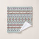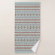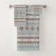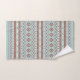 Azteca influyó en el patrón de motivos mixtos en colores oxidados y un detalle de color crema en un fondo azul. Repetir el patrón en las toallas de baño y las manos.
