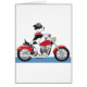 Un perro está montando una motocicleta roja. Sus oídos, bufanda y cola están volando en el viento y su casco tiene etiquetas del hueso.