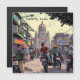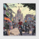 Ilustracion estilo libro de historietas en el centro de Kolkata, India Parked motos y tarjetas. Un imán con un ilustracion de calle concurrida en el centro, con edificios, restaurantes, tiendas y gente en sus motos.