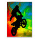 La acción de los deportes y la energía de los atletas del motocrós se capturan en siluetas de las figuras de acción que demuestran trucos y trucos extremos en sus motocicletas. Las pinturas de Digitaces y los ilustraciones de estas adolescencias y hombres jovenes incluyen los fondos de colores brillantes, vivos y salpican y estallan de luz para destacar la acción. También muestran apagado en sucio y nervioso de las escenas del camino donde los competidores ganan sus creds de la calle que muestran apagado sus habilidades del motocrós.