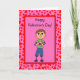 Envíe un saludo de la tarjeta del día de San Valentín con este muchacho que sostiene una caja de caramelo en sus manos. Él lleva un azul y verde y tiene un marco rojo con una frontera roja del modelo del corazón. "El día de San Valentín feliz!" texto en el interior delantero y en blanco para su propio arreglo para requisitos particulares.