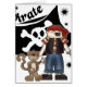 ¡Un pirata del muchacho con un mono y el cráneo y la bandera pirata señalan por medio de una bandera y el texto que lee al "pirata" se ofrece en las camisetas del tema del pirata, tarjetas, mousepads, tazas, pegatinas, y más!