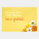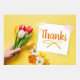 Di gracias por este diseño único que incluye un simple mensaje en una nota pegajosa, "¡Gracias!" El diseño aparece en segundo plano con un ramo de tulipán de mano. Todo el texto puede personalizarse para satisfacer sus necesidades, pero tiene este texto de marcador de posición. "Tu ayuda marcó una gran diferencia. Estoy agradecido".