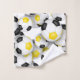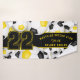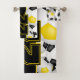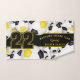 Esta toalla de espíritu de equipo para jugadores de fútbol tiene colores de equipo negro y oro variados, pelotas de fútbol giradas de todas maneras en un fondo blanco - personalizar la toalla de baño y la toalla de mano con un número jersey prominente en negro sobre una franja de color negro de largo, sobre la que también se puede personalizar el nombre del atleta, nombre del equipo y nombre de la mascota en oro - por katz_d_zynes
