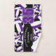Esta toalla atlética para jugadores de voleibol tiene balones de voleibol de tamaños variados, morados, negros y blancos, girados de todas formas sobre un fondo blanco y un número jersey prominente en morado, sobre una franja de color negro de gran longitud, sobre la que también se puede personalizar el nombre del atleta, el nombre del equipo y el nombre de la mascota - por katz_d_zynes