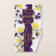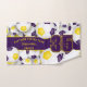 Esta toalla de espíritu de equipo para jugadores de fútbol tiene balones de fútbol de tamaño variado con colores violeta y dorado de equipo girados de todas maneras en un fondo blanco y un número prominente de jersey en morado sobre una franja de color púrpura de longitud completa, sobre la que también se puede personalizar el nombre del atleta, nombre del equipo y nombre de la mascota en oro - por katz_d_zynes