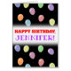 Este colorido diseño de la tarjeta "FELIZ BIRTHDAY" presenta un patrón de muchas representaciones de globos flotantes coloreadas con varios colores pastel. También cuenta con un nombre de personalizable en la parte delantera y un mensaje personalizado en el interior.