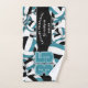 Esta divertida toalla para los jugadores de voleibol tiene balones de voleibol de tamaño variado con colores de equipo verde azulado y negro que se dan de vuelta en un fondo blanco y un número jersey prominente en verde azulado sobre una franja de color negro de longitud completa, sobre la que también se puede personalizar el nombre del atleta, nombre del equipo y nombre de la mascota - por katz_d_zynes