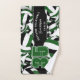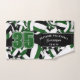 Esta toalla de color para jugadores de voleibol tiene balones de voleibol de tamaño variado verde, negro y blanco, girados de todas formas sobre un fondo blanco y un número jersey prominente en verde sobre una franja de color negro de largo y negrita, sobre la que también se puede personalizar el nombre del atleta, nombre del equipo y nombre de la mascota - por katz_d_zynes