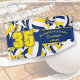 Esta fresca toalla para los jugadores de voleibol tiene balones de voleibol de tamaño variado azules, dorados y blancos, girados en todo el camino sobre un fondo blanco y un número prominente de jersey en oro sobre una franja de color azul audaz y de largo, sobre la que también se puede personalizar el nombre del atleta, nombre del equipo y nombre de la mascota - por katz_d_zynes