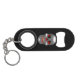Un cráneo de mueca con los agujeros rojos del ojo que brillan intensamente en el frente y la parte trasera del abrelatas.