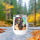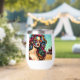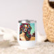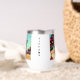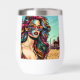 Botella de agua personalizada. Arte ai único que representa a una hermosa mujer moderna con cabello colorido y gafas de sol en un bikini en la playa con un reflejo en ellos. Arte pop de cómic fracturado.
