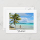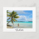 Postal de una mujer en bikinis bajo una palmera colgante en las aguas poco profundas de la laguna en la playa de una isla tropical en el archipiélago pacífico Polinesia Francesa con un borde blanco y el texto: "Tahití".
