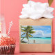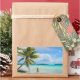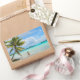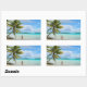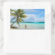 Pegatina rectangular de una mujer en bikinis bajo una palmera colgante en el agua poco profunda de la laguna en la playa de una isla tropical en el archipiélago pacífico, Polinesia Francesa.