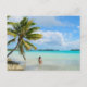 Postal de una mujer en bikinis bajo una palmera colgante en las aguas poco profundas de la laguna en la playa de una isla tropical en el archipiélago pacífico Polinesia Francesa.