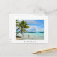 Postal de una mujer en bikinis bajo una palmera colgante en las aguas superficiales de la laguna en la playa de una isla tropical en el archipiélago pacífico Polinesia Francesa con un borde blanco y el texto: 'Rangiroa'.