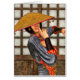 Representación digital en 3D de una hermosa mujer de batalla asiática sobre el fondo tradicional de un templo