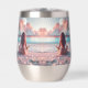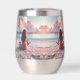 Mujer hermosa meditando en una playa de arena blanca y brillantes cristales de mar. Nubes esponjosas de color rosa y azul y agua azul pálido.