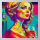 Resumen de arte en el que se muestra a una mujer sosteniendo una copa de vino. Hermosa dama colorida y abstracta con vino en rosa, azul y amarillo.