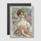 Envíe como tarjeta de agradecimiento o como fiesta de primavera. Postal de propósito para cualquier ocasión. Este hermoso diseño presenta a una mujer victoriana sosteniendo varias rosas rosas rosas y sus hojas y tallos ligeramente en sus brazos. El fondo es un estilo abstracto de acuarela variada.