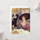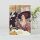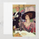 Ilustración vintage de comida y bebidas con una mujer elegante que lleva un sombrero elegante con plumas y un collar de perlas bebiendo champán y fumando cigarrillos en un restaurante con un camarero que mira con sorpresa.