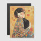 Una pintura soñadora inspirada en Klimt de una mujer abrazando un gato negro, con intrincados patrones florales y de oro. Los tonos cálidos y las delicadas pinceladas evocan una sensación de amor, confort y elegancia artística.