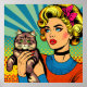 Arte retro de arte pop de estilo cómico hecho con una mujer de ambiente de medio siglo sosteniendo un lindo gato. Arte ai brillante y colorido.