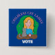 Un botón azul cuadrado con una mujer fuerte e independiente con su gato gris. El texto dice "Las damas de gato sin hijos votan" , pero puedes cambiarlo por tu cuenta . © ArianeC Ilustraciones-Todos los derechos reservados