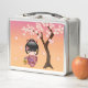 Ilustracion vectorial de un lindo chica oriental con un vestido de kimono de cerezo oscuro con un amplio cordón obi sosteniendo un farol de papel amarillo del festival. El pelo negro chica está decorado con flores y peinados de estilo geisha. Esta obra de arte se inspiró en las tradicionales muñecas kokeshi de Japón. Sakura es un cerezo japonés, también usado como nombre de chica. El floreciente cerezo es un simple fondo.