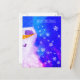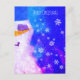 Hermoso muñeco de nieve invernal y tarjeta postal de Navidad con copos de nieve. Deseo de Feliz Navidad para tus amigos y familiares - puedes cambiar el texto. Los copos de nieve blancos sobre un fondo abstracto azul y rosa hacen que esta tarjeta postal sea mágica y de cuento de hadas.