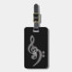 Una elegante etiqueta de equipaje con temas de música blanca y negra - trébol blanco y arcos de bajo contra un fondo negro texturado. Amor musical. Personalízalo con tus datos en la parte posterior =)