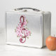 Pink treble clef with delicate, detailed pink Japanese cherry blossoms against white background painted over with light blue paint. Blooming pink sakura.