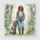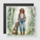 Cette aquarelle représente une jeune femme aux cheveux bouclés portant des lunettes de soleil, vêtue d'une chemise à carreaux et d'un jean déchiré. Elle se tient debout dans une forêt lumineuse et brumeuse, tenant un étui à guitare à la main. L'atmosphère évoque une artiste voyageuse en harmonie avec la nature.