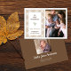 Este saludo fotográfico de Acción de Gracias también sirve como anuncio de nacimiento. Cuenta con un patrón de manto de color marrón claro y un fotograma vertical para tu foto favorita. El texto aparece en la caja blanca y es muy sencillo y mínimo. El reverso ofrece un marco fotográfico adicional para una imagen del texto recién nacido y personalizado de las estadísticas de nacimiento. Fotografía © Storytree Studios, Stanford, CA